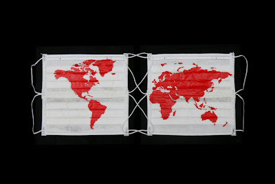 « Le planisphère peint en rouge comme une tache de sang sur le masque sanitaire blanc, apparaît comme le signal d’alerte d’un monde mis en danger par l’homme. » Zevs